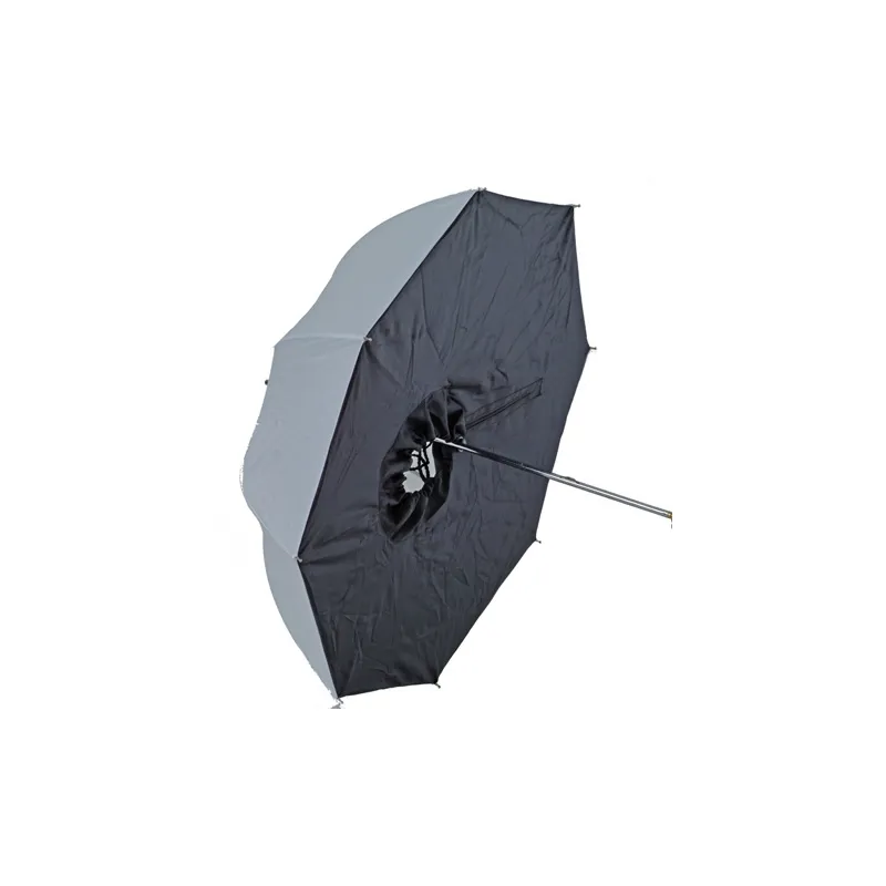 A softbox umbrella (brolley) can easily be brought along on location and is the low-priced alternative for a softbox. A softbox is more difficult to bring along on location and damages more easily. A softbox umbrella however is quickly unfoldable, less vulnerable and fits on almost any flash unit. This softbox umbrella has to be mounted in the umbrella mount of the flash unit and has a diffuse white colored (translucent) outside and is made of a black fabric inside. Suitable for direct diffuse light.