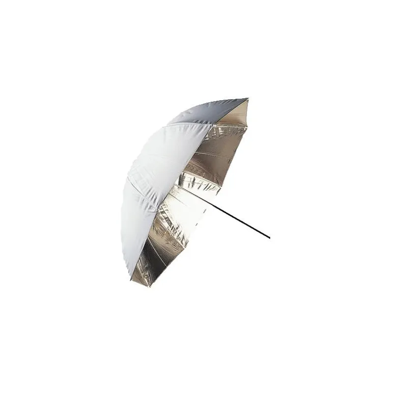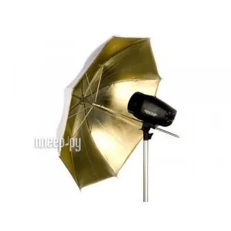 This Falcon Eyes flash umbrella has a golden interior coating and a white, translucent (diffuus) exterior coating. An umbrella with a golden coating inside reflects warm light.